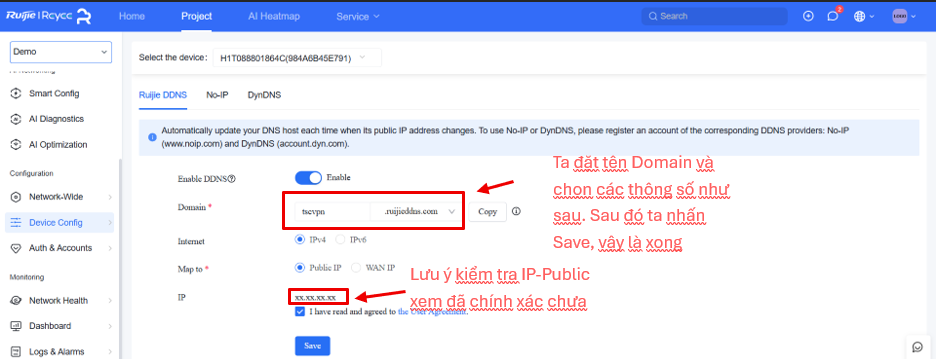 *Lưu ý: Hiện tại dịch Ruijie DDNS chỉ có thể cấu hình trên Rujie Cloud.