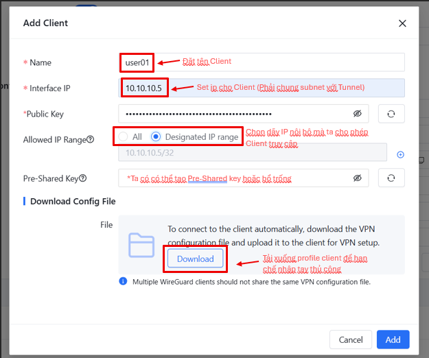 Sau khi đã tạo thành công VPN Server, trong cùng mục đó, kéo xuống và chọn “add client” > Tiến hành tạo User VPN > Chọn Add