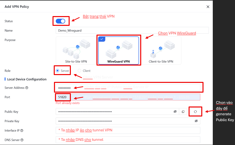 Chọn vào mục Device Config à Add VPN Policy à Wireguard VPN.